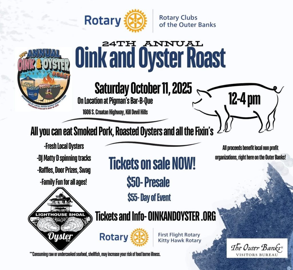 Get your tickets NOW…..for the 24th Annual Oink and Oyster Roast presented by First Flight Rotary Club!